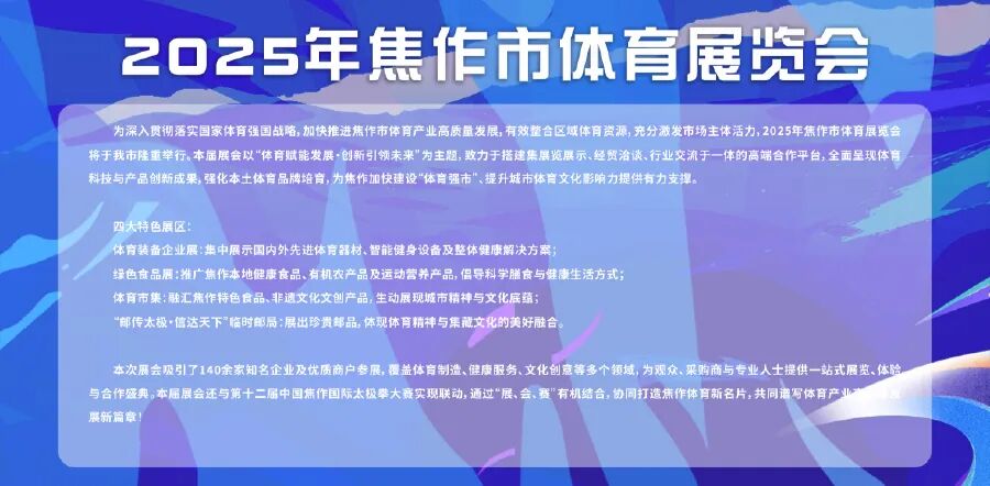 展览会还将与9月15日开幕的第十二届中国·焦作国际太极拳大赛暨2025云台山旅游节实现联动,通过“展、会、赛”有机结合,协同打造焦作体育新名片。
